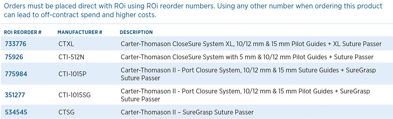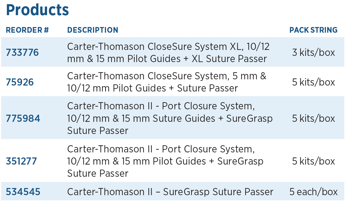 Can be positioned with trocar in place. Single-use kit including 10/12 mm and 15mm Suture Guides and SG Suture Passer.