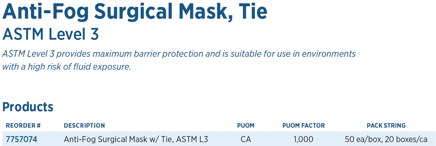 The Regard® ASTM Level 3 Anti-Fog Surgical Mask provides maximum barrier protection and is suitable for use in environments with a high risk of fluid exposure. The Anti-Fog technology prevents condensation from escaping the top of the mask, leaving glasses clear. Tie-back design provides universal size, flexibility, and comfort.