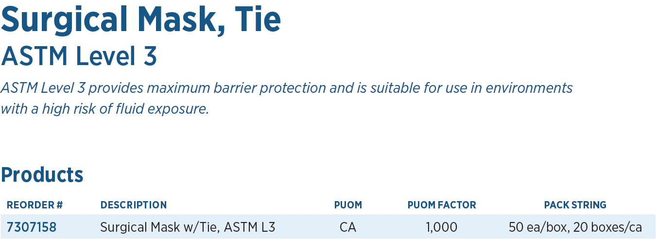 Regard® ASTM Level 3 Surgical Mask is designed to provide maximum barrier protection, including environments with a high risk of fluid exposure, while ensuring comfort and breathability for the user. The soft, durable ties enable the user to adjust tightness and provide size flexibility while our pliable nosepiece allows forming over the nose to minimize fogging.